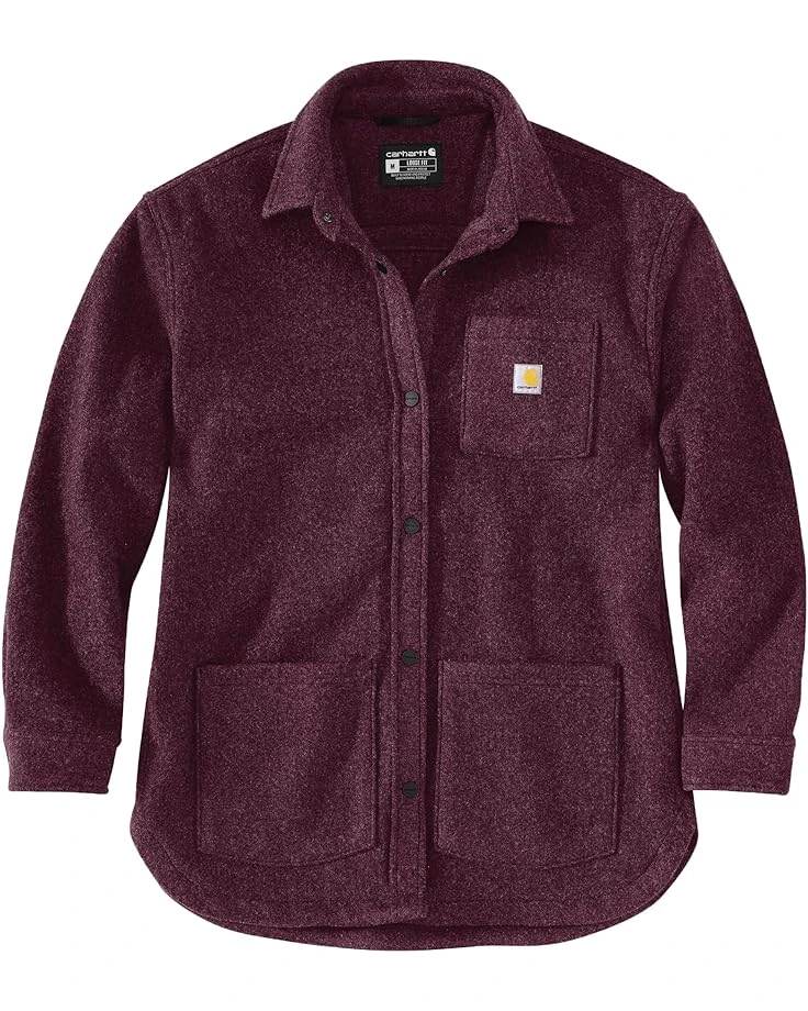 - Add the perfect layer of cozy comfort on chilly days in the Carhartt® Loose Fit Fleece Shirt Jacket. Featuring a spread collar with a front snap-button closure, long sleeves, snap-button closure cuffs, chest pocket and front hand pockets.